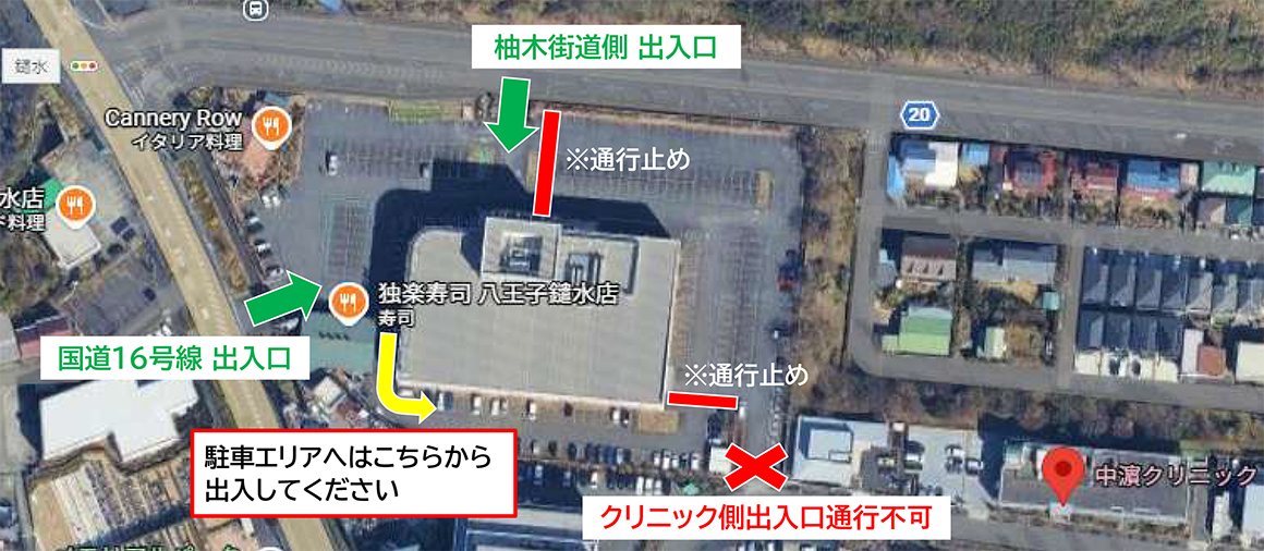 大型トラックの往来が激しくなる影響で、クリニック側からの出入りができなくなるため、国道16号線・柚木街道にある出入口をご利用ください。