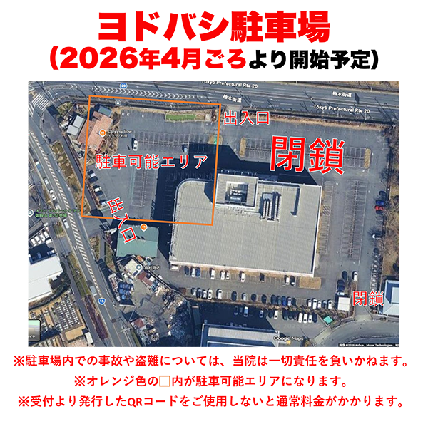 上記により、2026年4月頃に予定されている「ヨドバシ駐車場オープン」以降の駐車場ご利用につきましては「クリニック駐車場」「ヨドバシ駐車場」「メデック駐車場」の3箇所となりますので、どうぞよろしくお願い申し上げます。